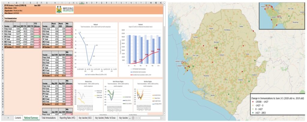 In Sierra Leone, the Expanded Program for Immunization (EPI), which is responsible for reducing the burden of vaccine-preventable diseases through childhood immunization services, is facing these challenges. Difficult decisions need to be made on where to prioritize services, based not only on pre-existing shortages but also on those hard hit by COVID-19 restrictions. To make these decisions, the program needs to know vaccine coverage, stock availability, implementation rates of planned activities, and services across the districts. In addition to the data, tools are needed to analyze available information, identify trends, and build a case for policymakers to invest in and prioritize immunization services amidst the pandemic.