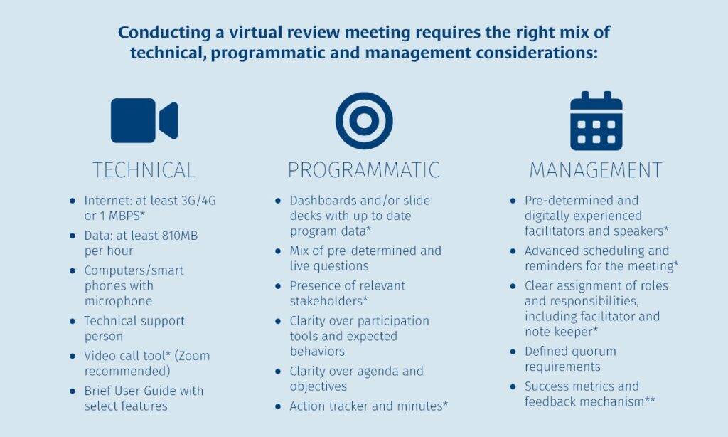 CHAI worked with the program to establish virtual data review meetings with four focus districts. For two hours each month, members of EPI’s management team, CHAI, district officers, and managers meet via videoconference to systematically review stock out trends, rank immunization performance compared to historical averages, and assess data quality from facilities. The meetings consider the technical, programmatic, and management requirements for a successful virtual review meeting (Figure 2).