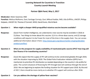 During the launch meeting for the Learning Network for Countries in Transition (LNCT),  participants had the opportunity to ask representatives from partner organizations their questions about partner policy, vaccine availability, and vaccine financing, among other topics.