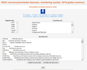 The WHO’s Immunization schedule selection center is a searchable database of global, regional, and national summaries on vaccine application. Each page includes information a description of the vaccine, antigens, ages vaccination is administered, and whether or not coverage is complete.