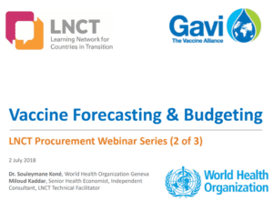 The LNCT webinar, ‘Vaccine Forecasting and Budgeting Tools and Best Practices,’ took place on 2 July 2018. The webinar materials were presented by Souleymane Koné, Technical Officer – Vaccine Management and Logistics, World Health Organization (WHO). Included here are the presentation materials used for the webinar.
