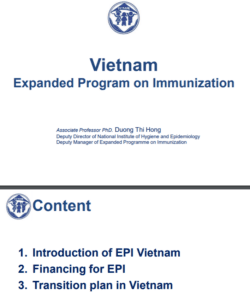 Country spotlight presentation given by Associate Professor Duong Thi Hong (Deputy Director of National Institute of Hygiene and Epidemiology, Deputy Manager of Expanded Program on Immunization) during the LNCT December 2017 Hanoi Meeting. The presentation introduces EPI Vietnam, its financing, and its plan for Gavi transition.
